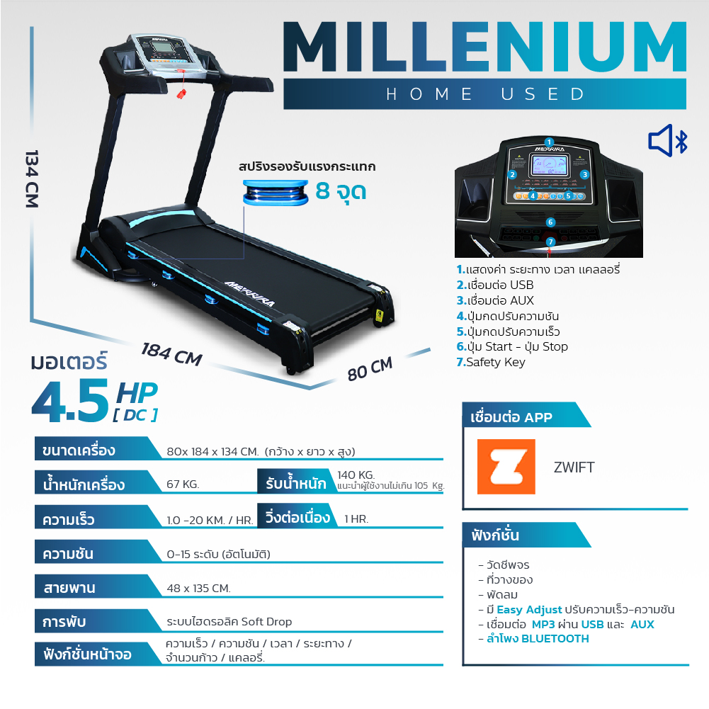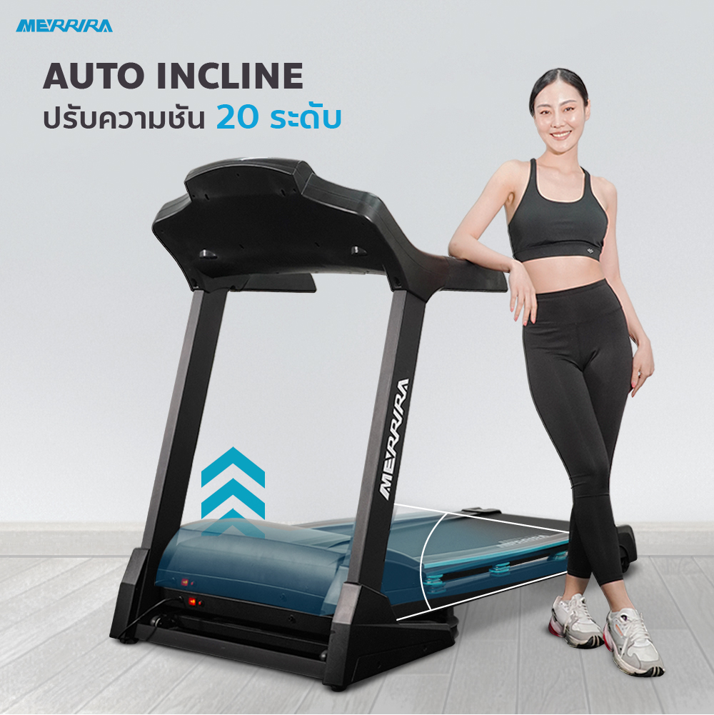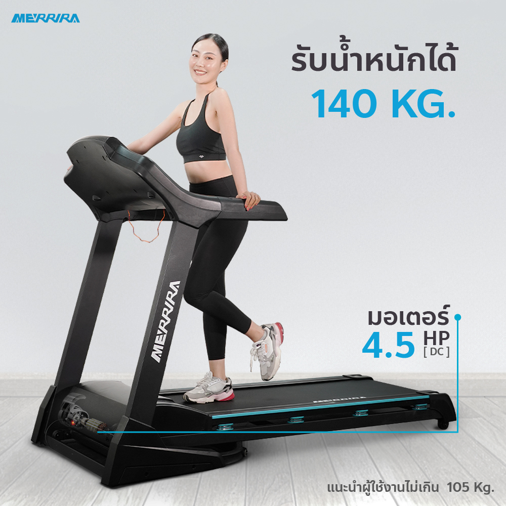ลู่วิ่งไฟฟ้า รุ่น MILLENIUM จาก MERRIRA™ มอเตอร์ 4.5 HP พื้นที่วิ่ง กว้าง 48 ซม. x ยาว 135 ซม. ความเร็วสูงสุด 20 กม./ชม. ปรับความชันอัตโนมัติ 20 ระดับ Auto-Incline รับน้ำหนักได้สูงสุด 140 กิโลกรัม หน้าจอ LCD 5 นิ้ว **หลังใช้งาน 1 ชั่วโมง ให้พักเครื่อง 10-15 นาที ก่อนเพื่อยืดอายุการใช้งาน**